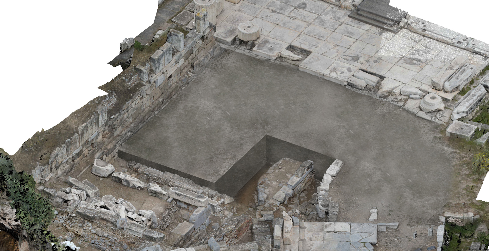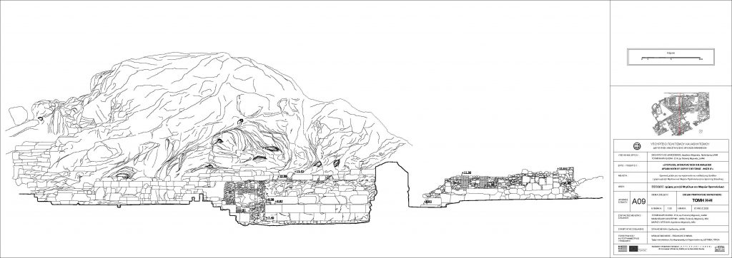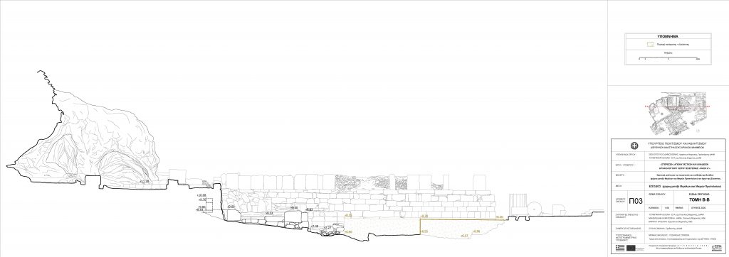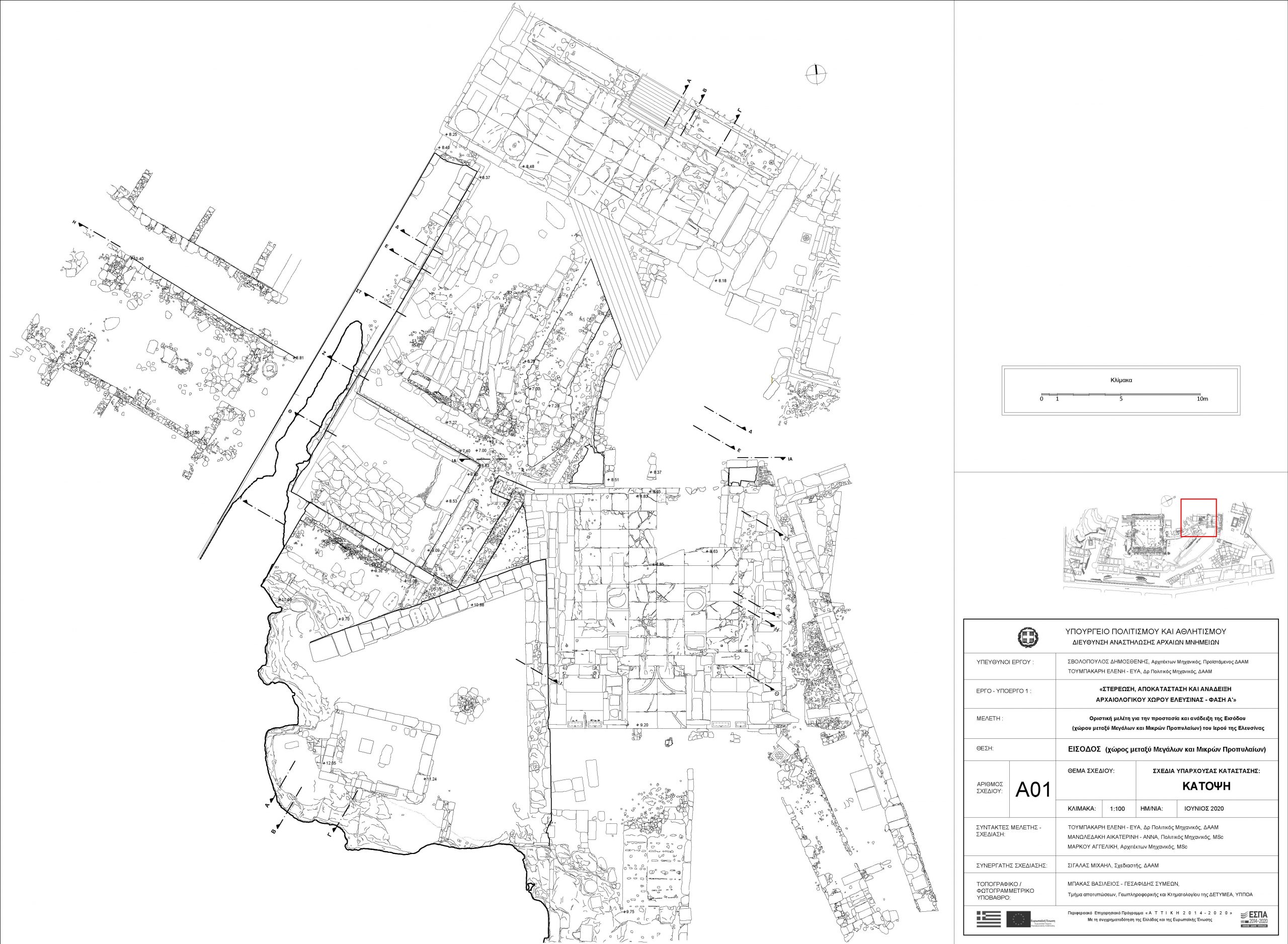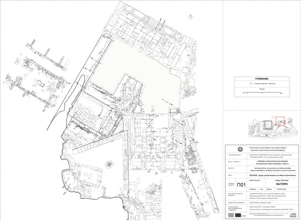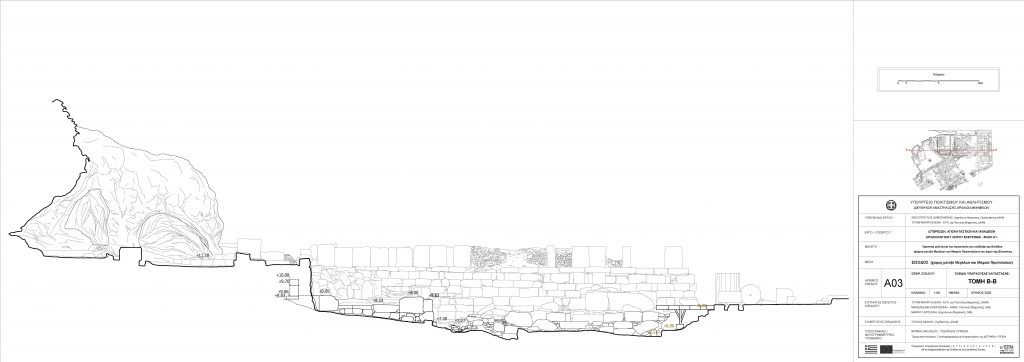 Επίσης, στο πλαίσιο της τεκμηρίωσης πραγματοποιήθηκε για πρώτη φορά λεπτομερής σχεδιαστική αποτύπωση της περιοχής επέμβασης. Τα γραμμικά σχέδια (κάτοψη και τομές) προέκυψαν βάσει επεξεργασίας του τρισδιάστατου ψηφιακού μοντέλου των Β. Μπάκα και Σ. Γεσαφίδη της ΔΕΤΥΜΕΑ, ΥΠΠΟΑ.