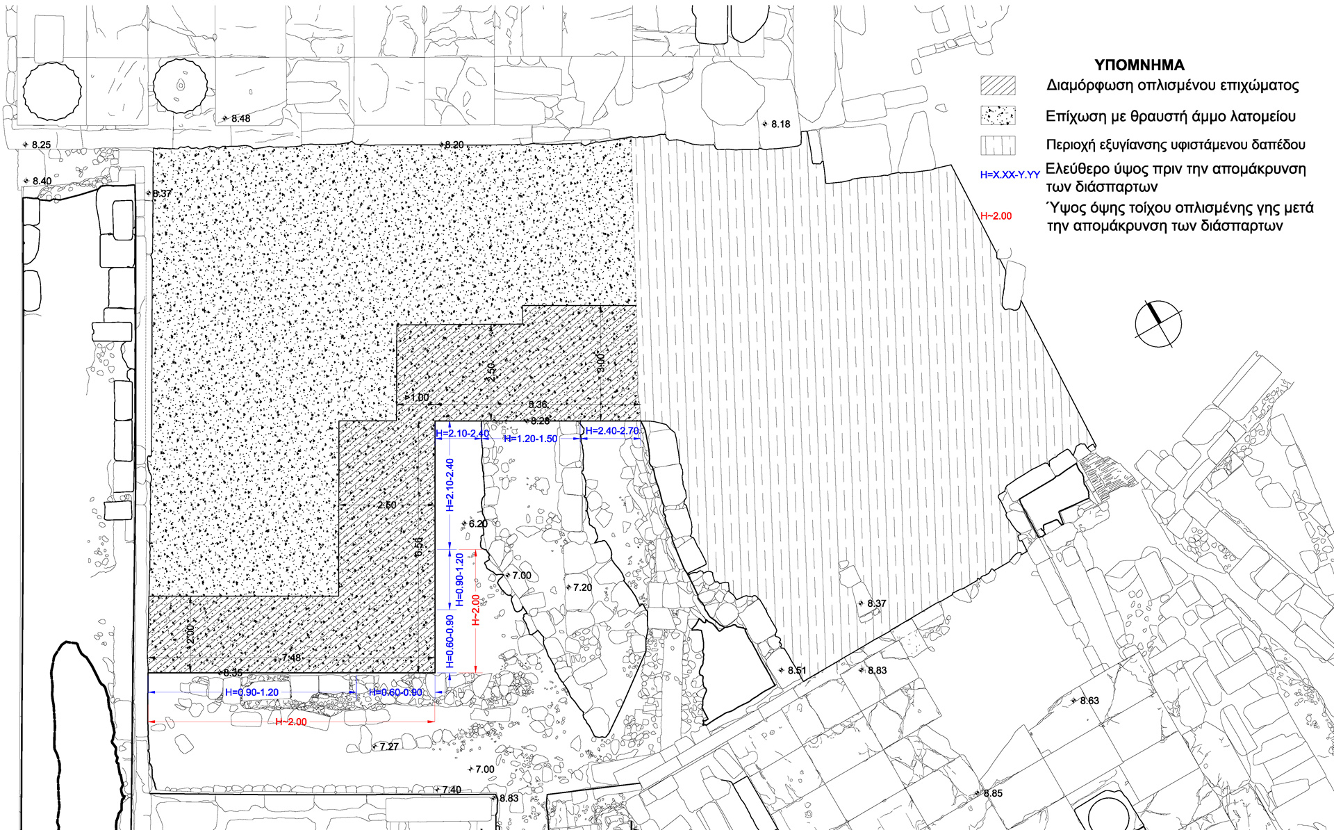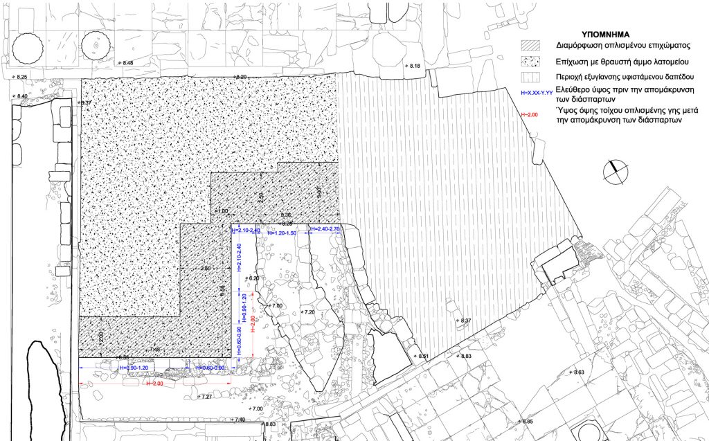 - της εξυγίανσης της ανώτερης ζώνης (πάχους 20cm) της υφιστάμενης επίχωσης στην περιοχή ανατολικά του ανατολικού “τοίχου αντιστήριξης” των ανασκαφέων. Για λόγους ομοιομορφίας θα εφαρμοστούν όλα τα προβλεπόμενα για την τελική στρώση της περιοχής κατάχωσης (υλικό και τρόπος υλοποίησης)