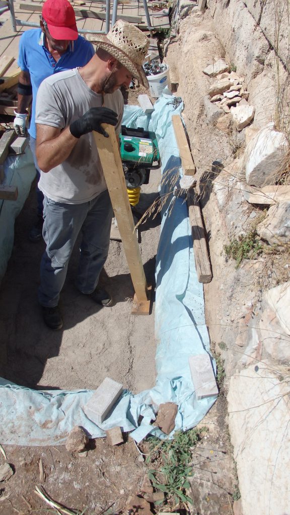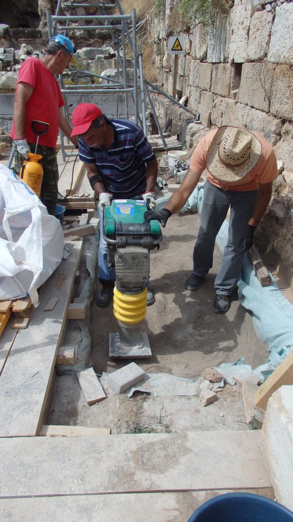 α) Εργασίες συμπύκνωσης θραυστής άμμου λατομείου στη θέση οριστικής τοποθέτησης του μέλους, με τη βοήθεια μηχανοκίνητου εξοπλισμού μικρής δυναμικότητας (κατσικιού). Προς αποφυγή πρόκλησης φθορών στο γειτονικό υστερορωμαϊκό τείχος, η συμπύκνωση στη ζώνη πλησίον της ανατολικής του παρειάς έγινε με χρήση χειροκίνητου εξοπλισμού. [Αικ.-Α. Μανωλεδάκη]