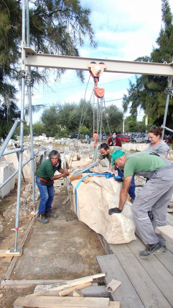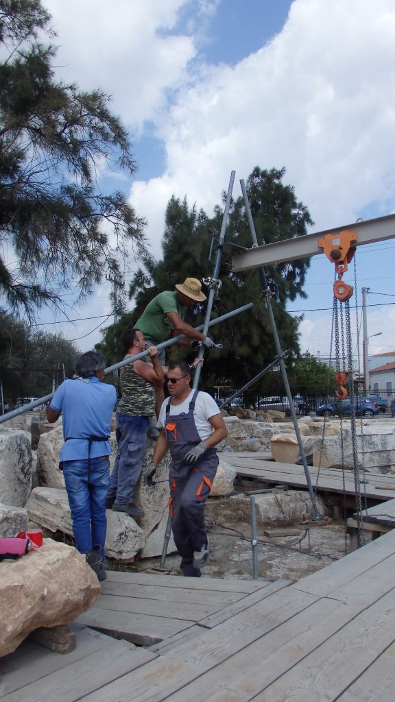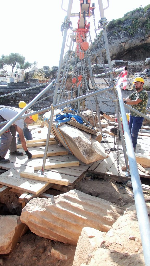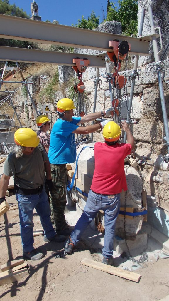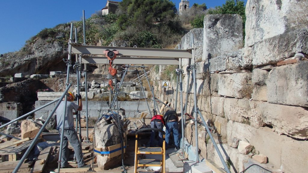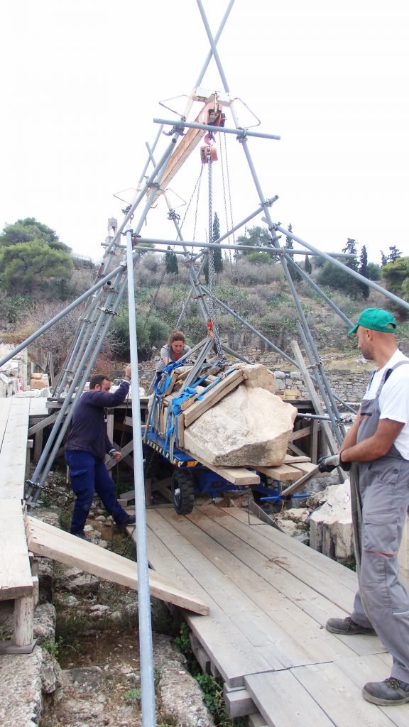 δ) Εργασίες οριστικής τοποθέτησης του μέλους στην Ρ. Στοά με τη βοήθεια διάταξης μονοραγίου. [Αικ.-Α. Μανωλεδάκη]