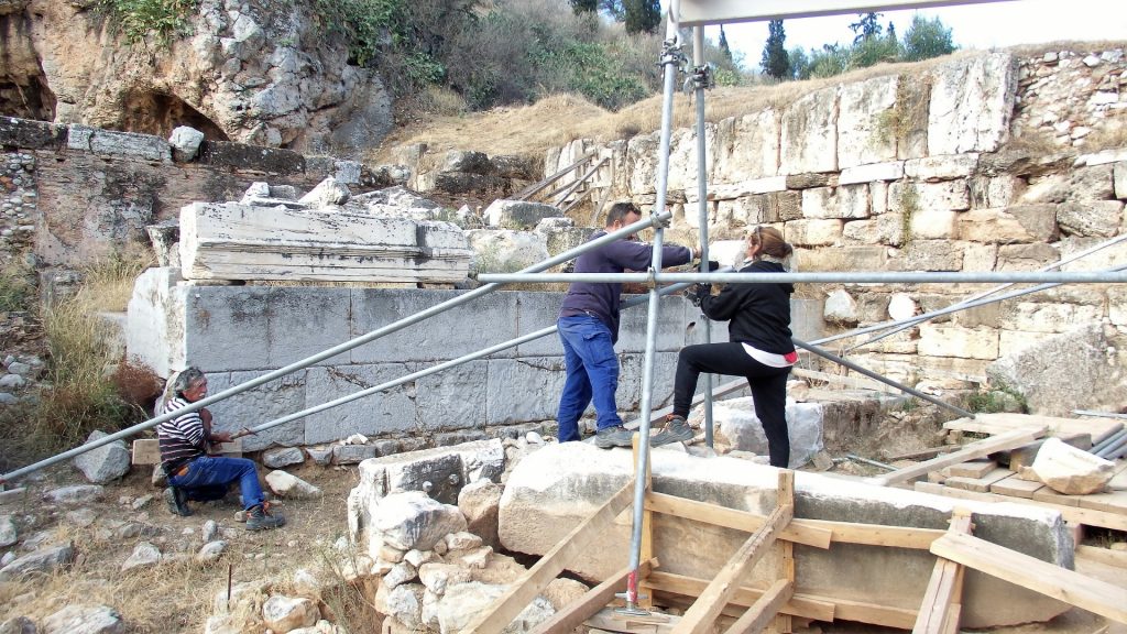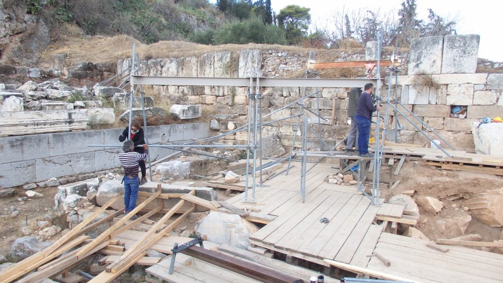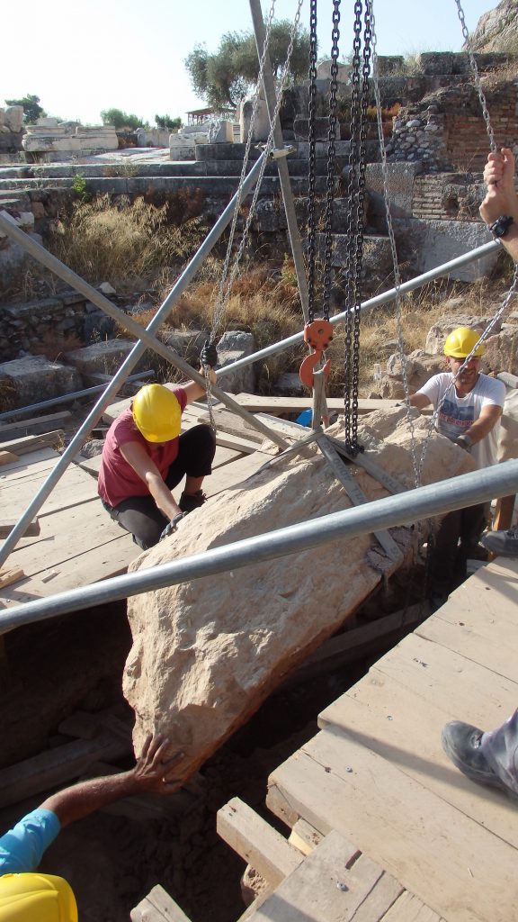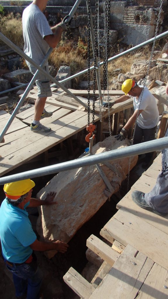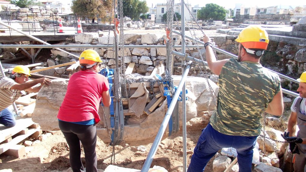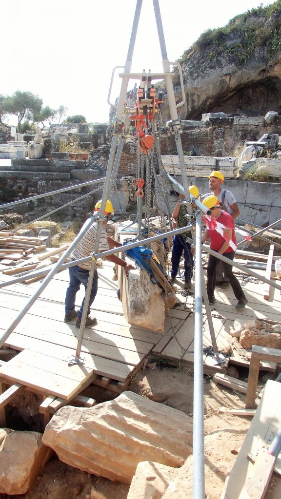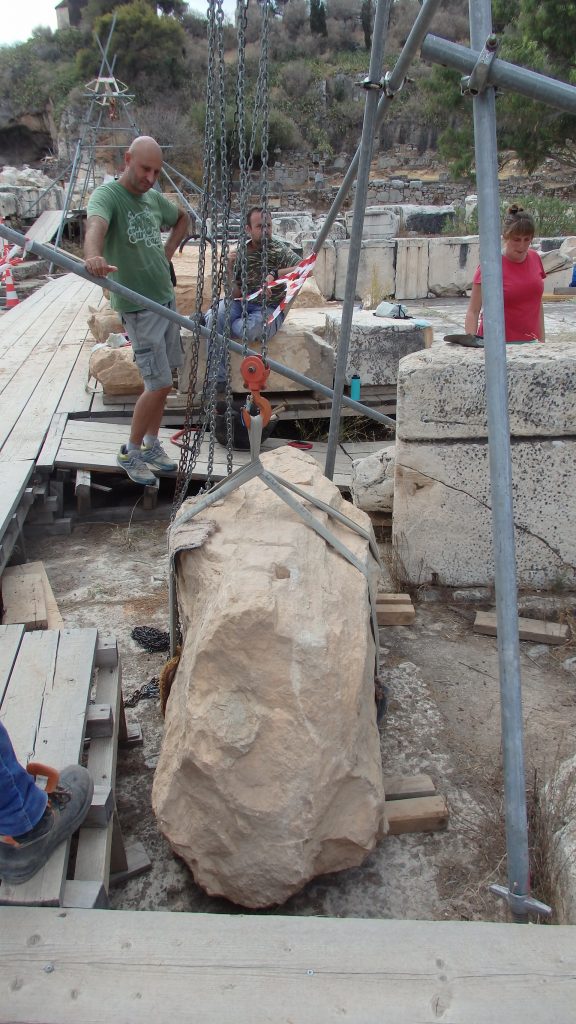 δ) Εργασίες οριστικής τοποθέτησης του μέλους στην Ρ. Στοά με τη βοήθεια διάταξης μονοραγίου. [Αικ.-Α. Μανωλεδάκη]
