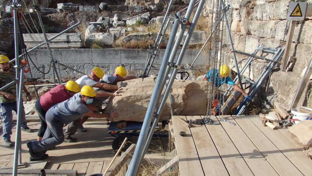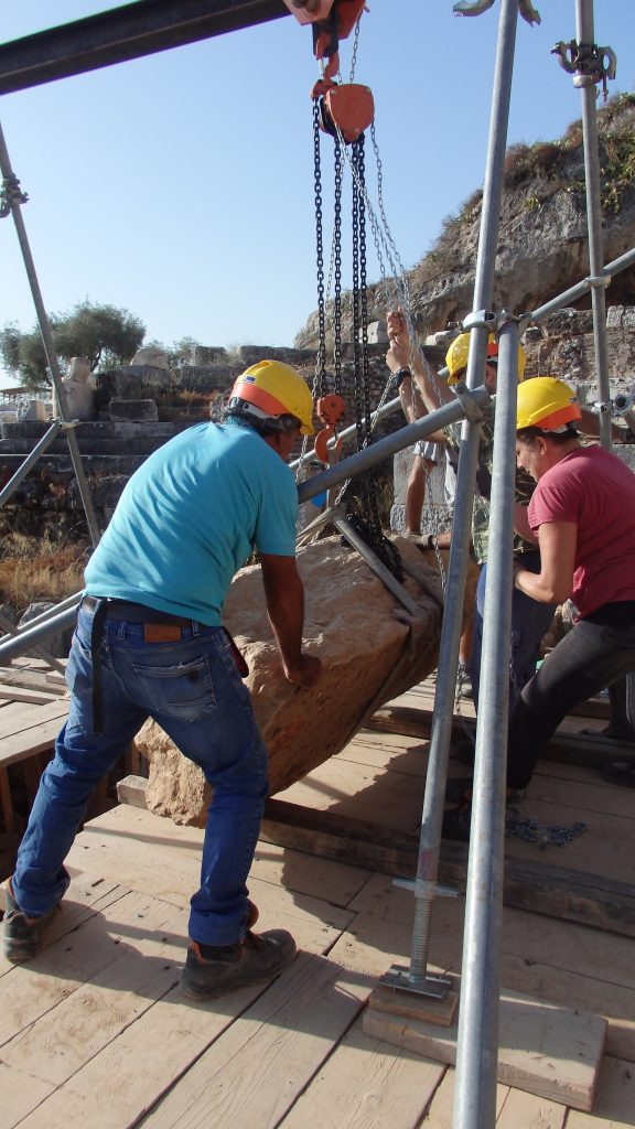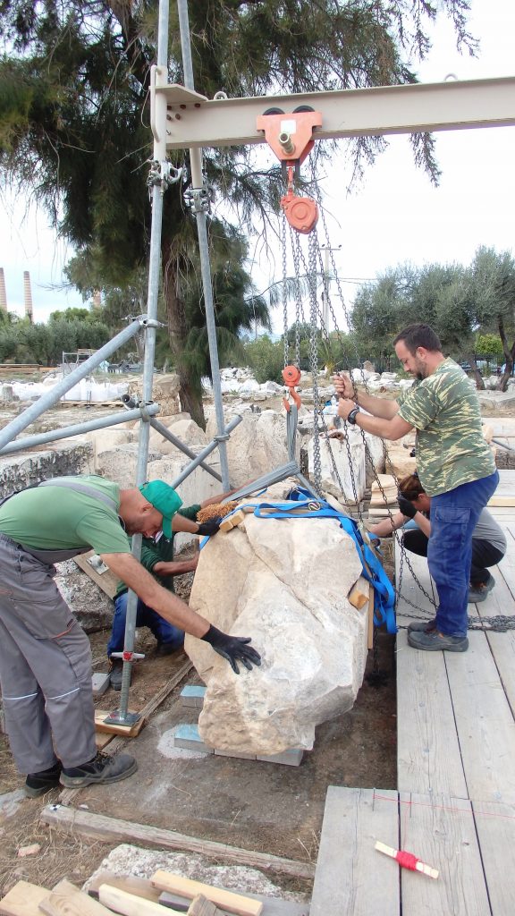 ε) Εργασίες αλφαδιάσματος των 4 τραβερτινικών στηριγμάτων, για την έδραση του μέλους, και οριστικής τοποθέτησής του με τη βοήθεια δύο εν παραλλήλω διατάξεων μονοραγίου. [Αικ.-Α. Μανωλεδάκη]