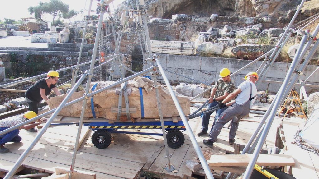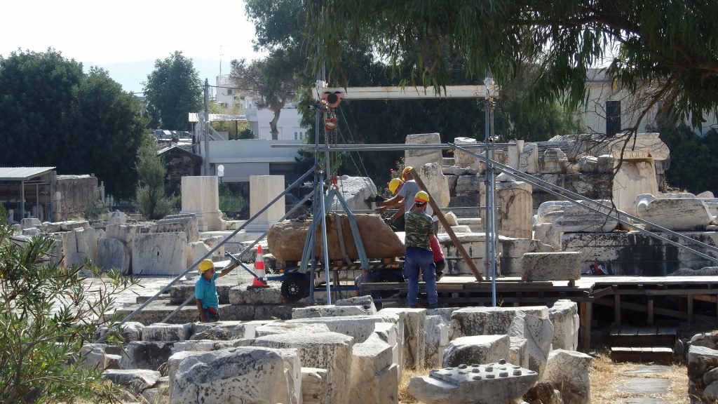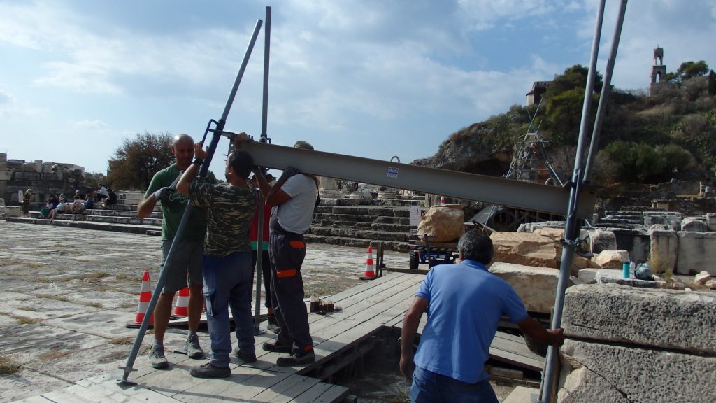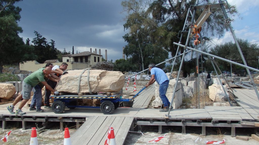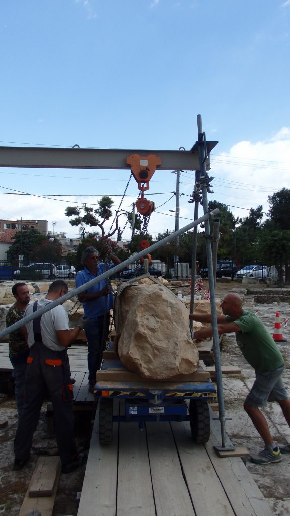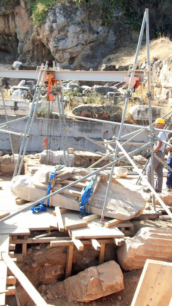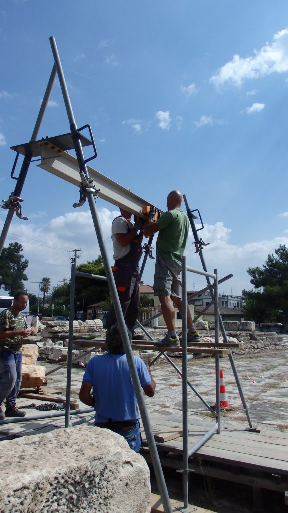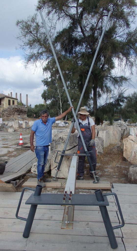 δ) Εργασίες οριστικής τοποθέτησης του μέλους στη Ρ. Στοά με τη βοήθεια τροχήλατης πλατφόρμας βαρέως τύπου και διάταξης μονοραγίου. [Αικ.-Α. Μανωλεδάκη]