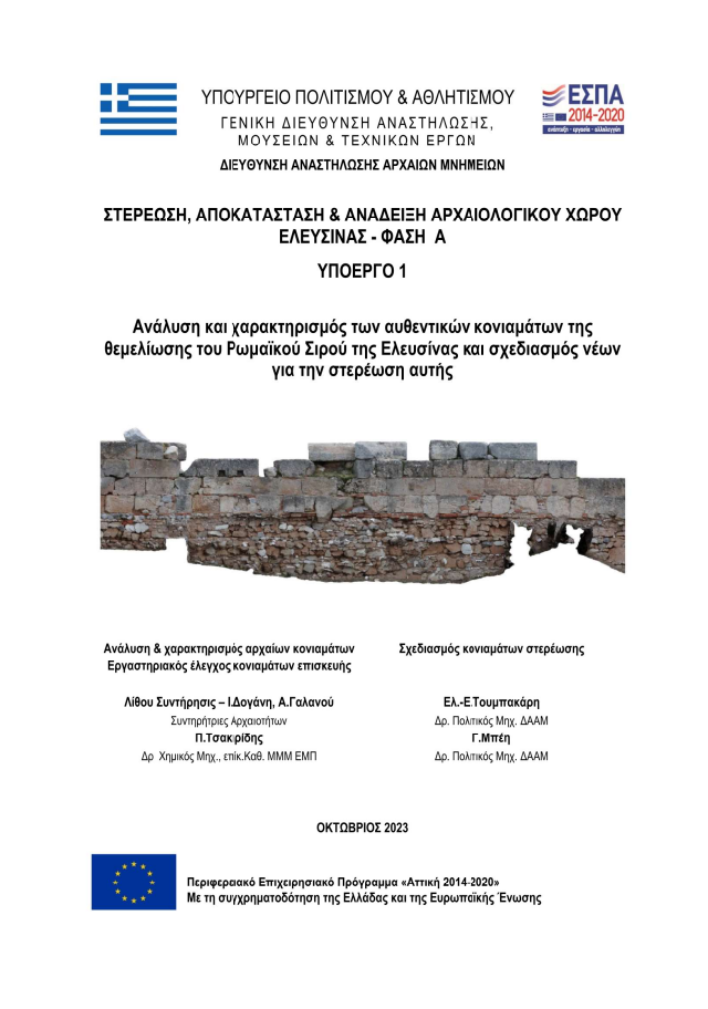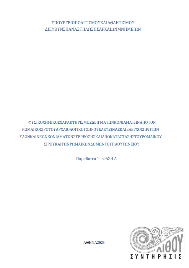 Λίθου Συντήρησις (2023). Παραδοτέο 1 – ΦΑΣΗ Α: Φυσικοχημικός χαρακτηρισμός δειγμάτων κονιαμάτων από τον Ρωμαϊκό Σιρό του αρχαιλογικού χώρου Ελευσίνας και έλεγχος πρώτων υλών και νέων κονιαμάτων στερέωσης και αποκατάστασης του ρωμαϊκού σιρού και των ρωμαϊκών δομών του Πλουτωνείου.