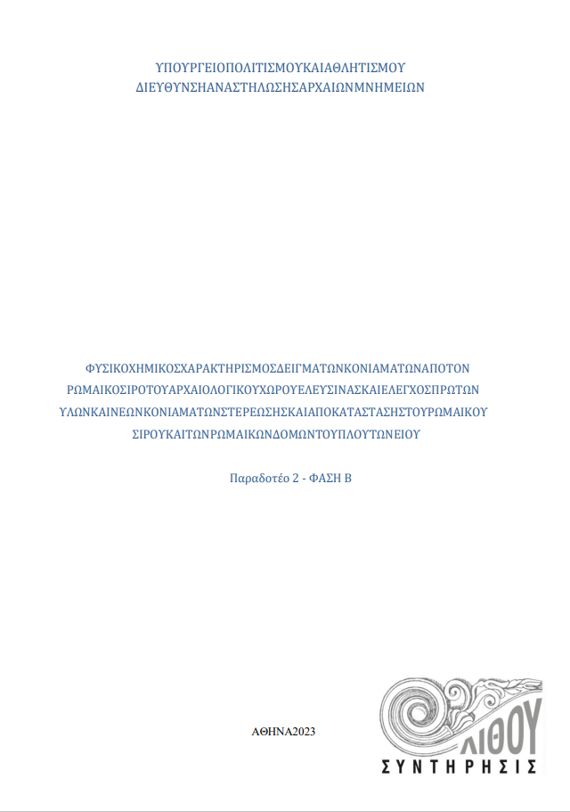 Λίθου Συντήρησις (2023). Παραδοτέο 2 – ΦΑΣΗ Β: Φυσικοχημικός χαρακτηρισμός δειγμάτων κονιαμάτων από τον Ρωμαϊκό Σιρό του αρχαιλογικού χώρου Ελευσίνας και έλεγχος πρώτων υλών και νέων κονιαμάτων στερέωσης και αποκατάστασης του Ρωμαϊκού Σιρού και των ρωμαϊκών δομών του Πλουτωνείου.