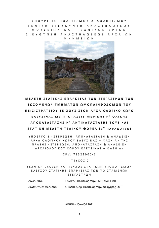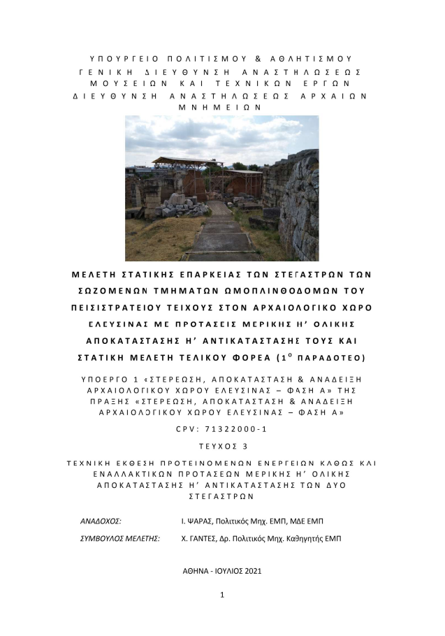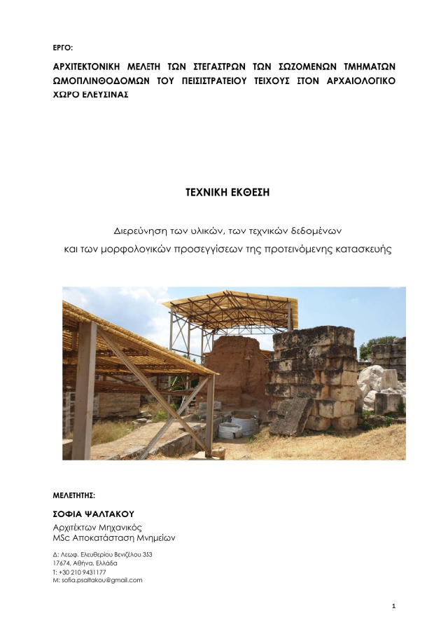 Ψαλτάκου, Σ. (2021). Αρχιτεκτονική μελέτη των στεγάστρων των σωζόμενων τμημάτων ωμοπλινθοδομών του Πεισιστράτειου τείχους στον αρχαιολογικό χώρο Ελευσίνας – Τεχνική έκθεση.
