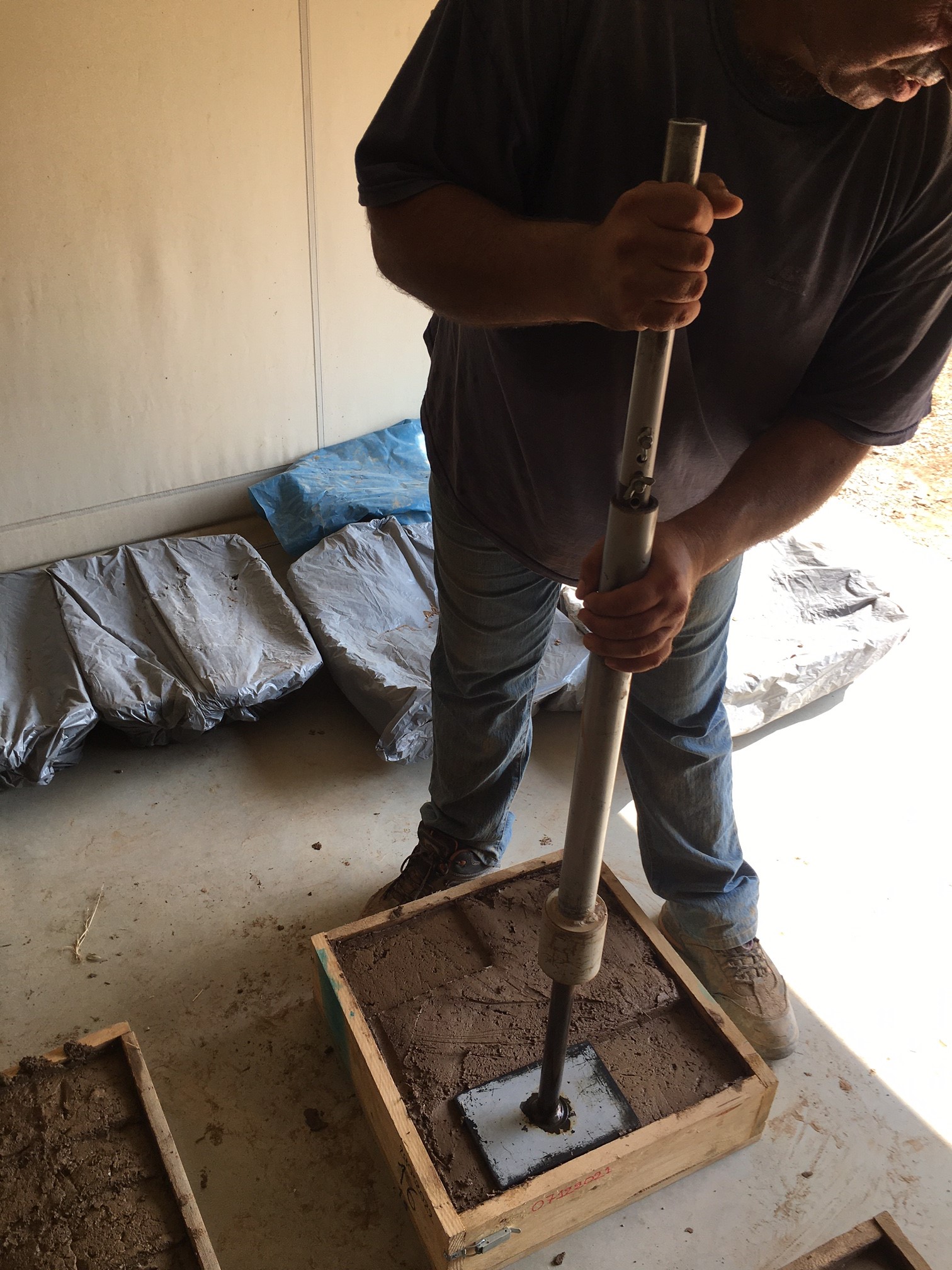 Η παράλληλη εργαστηριακή έρευνα προχώρησε σε παραγωγή δοκιμίων ωμοπλίνθων, χωρίς άχυρο, σε κλίμακα μικρών κύβων και κυλίνδρων για τον προσδιορισμό της διαδικασίας συμπύκνωσης. Η χειρωνακτική συμπύκνωση με χρήση κόπανου θα πρέπει να ήταν ο πιο διαδεδομένος τρόπος συμπύκνωσης στην αρχαιότητα για τη βελτιστοποίηση των ιδιοτήτων των ωμοπλίνθων. Αυτό που έπρεπε να προσδιοριστεί ήταν η ενέργεια συμπύκνωσης που έπρεπε να ασκηθεί. Στο εργαστήριο διερευνήθηκαν διάφορες στάθμες ενέργειας συμπύκνωσης, μελετήθηκαν οι παραγόμενες μικροδομές και λοιπά χαρακτηριστικά των δοκιμαστικών ωμοπλίνθων και συγκρίθηκαν με των αρχαίων. Η στάθμη ενέργειας που επελέγη ήταν εκείνη που οδηγούσε στην δημιουργία μικροδομής συμβατής με εκείνη των αρχαίων ωμοπλίνθων.