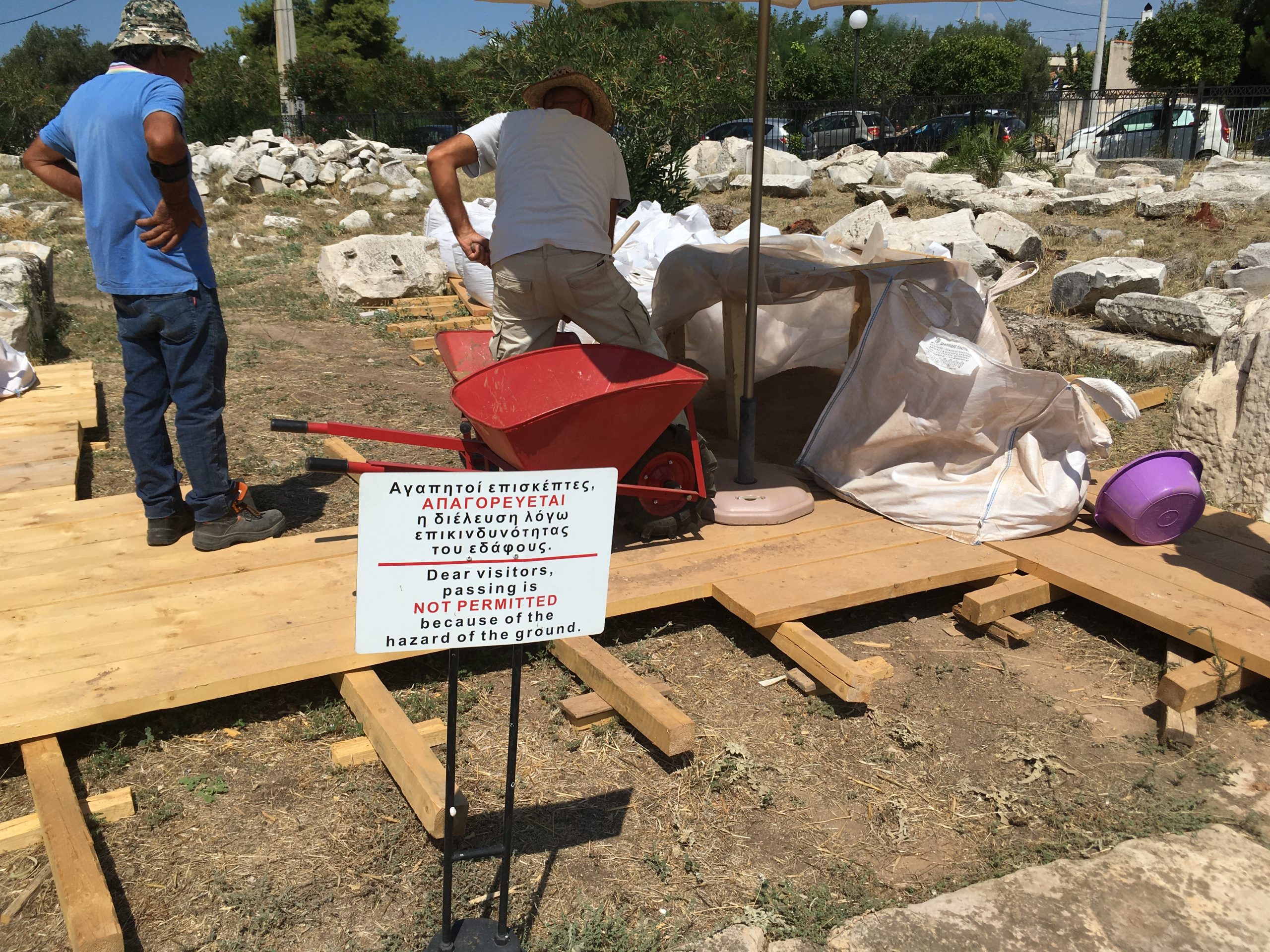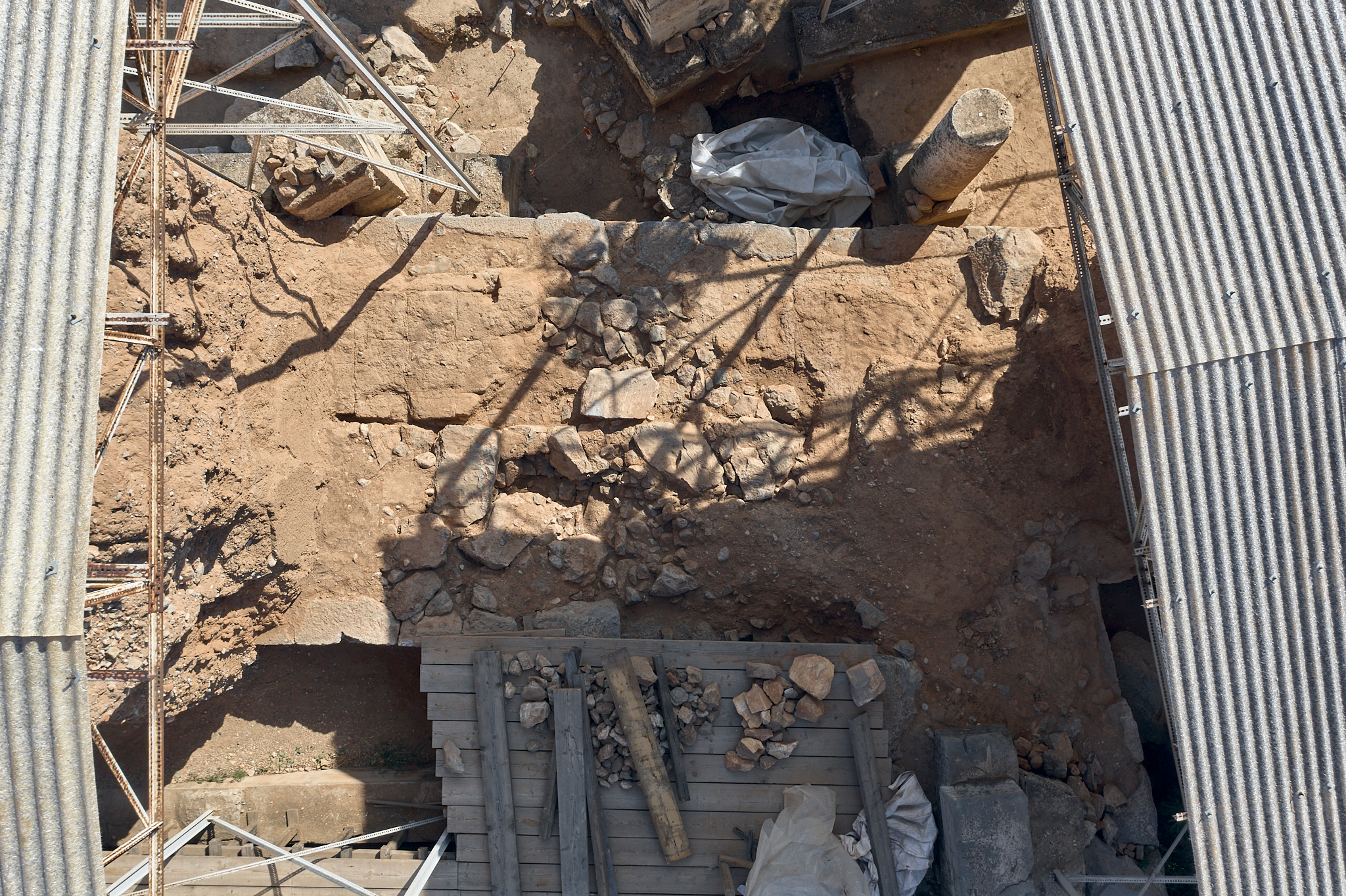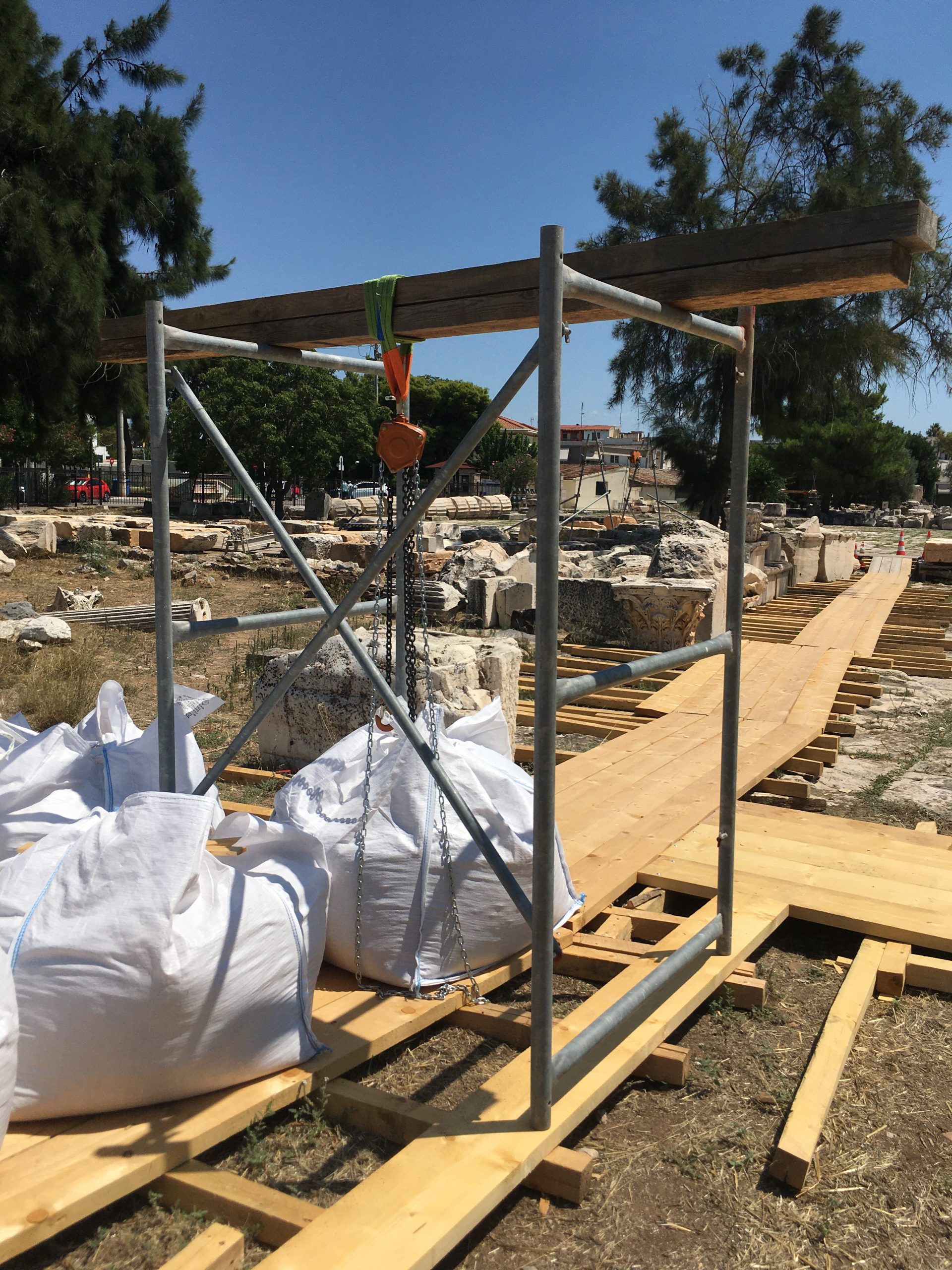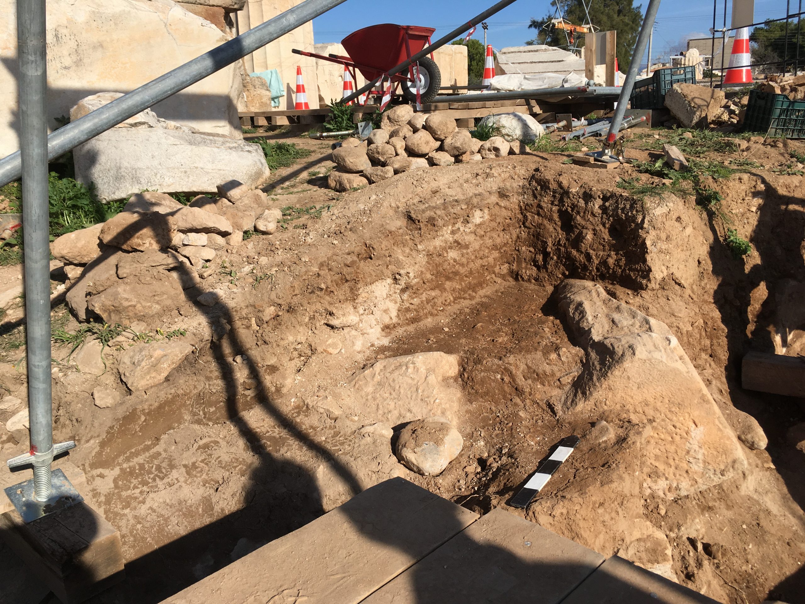 Με δεδομένη την καταλληλότητα προς χρήση του εδαφικού υλικού που προερχόταν από τις ανασκαφικές εργασίες εντός του αρχαιολογικού χώρου, οργανώθηκε η συγκέντρωσή του ως πρώτη ύλη παραγωγής.