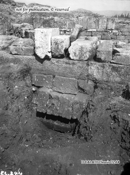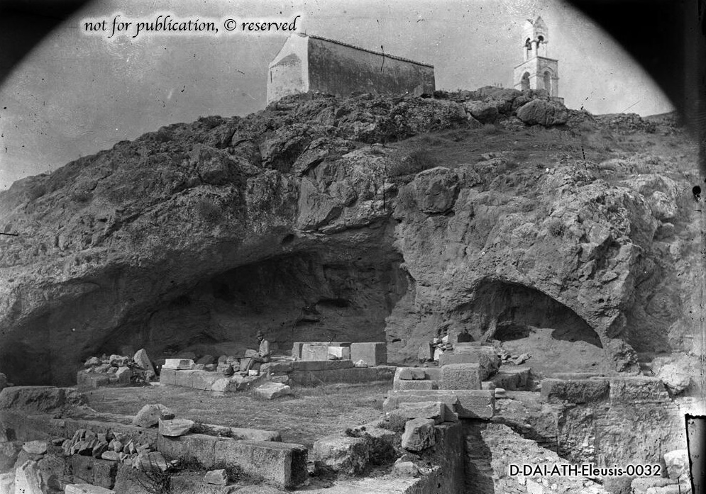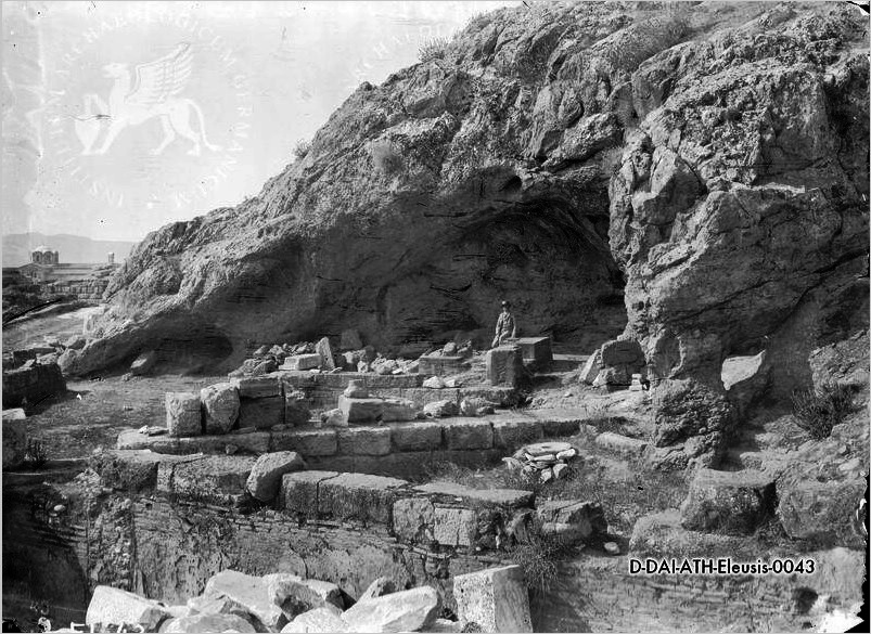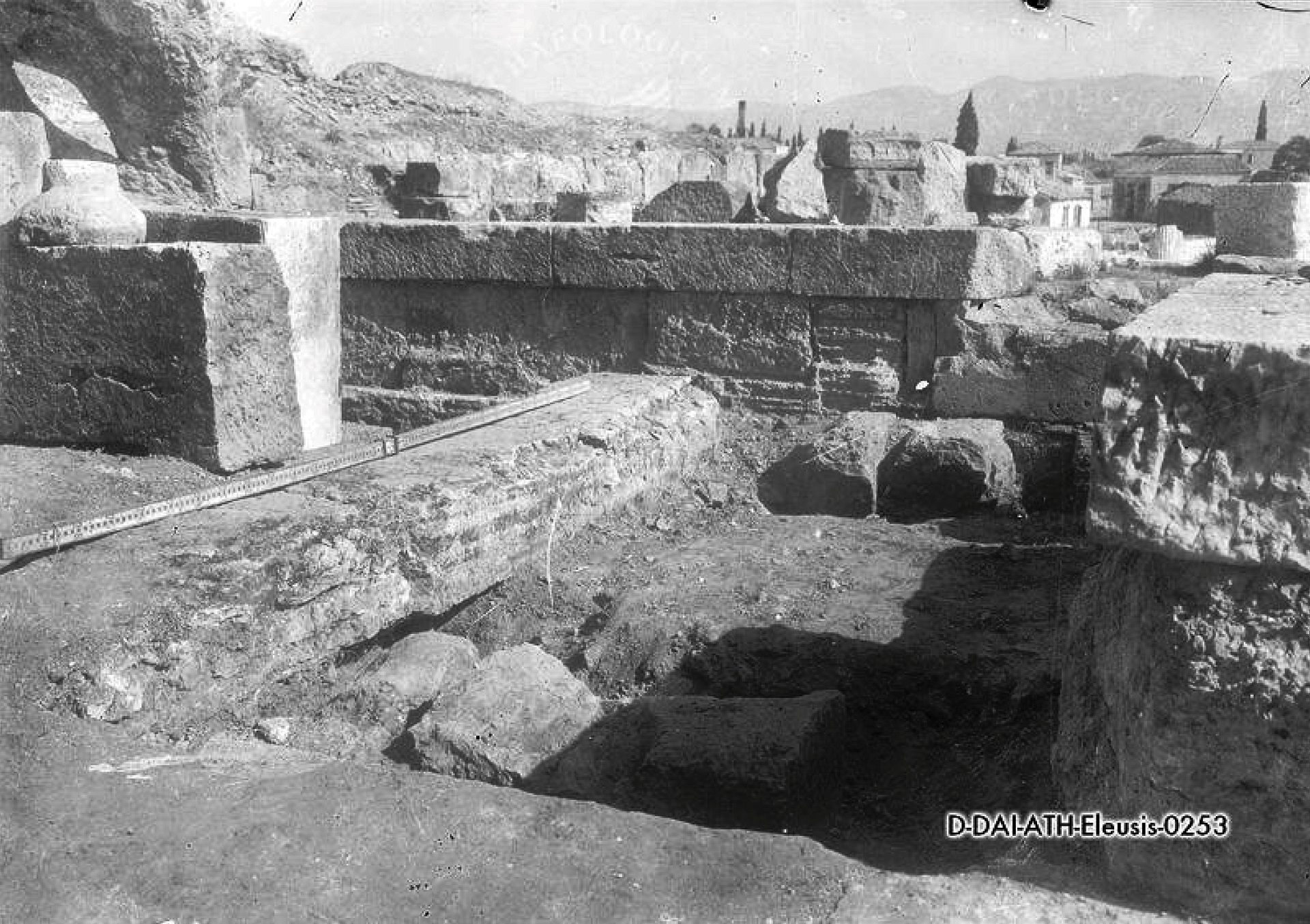 (γ) Ανασκαφές F. Noack το 1921: 1. άποψη του δυτικού τοίχου του περιβόλου από το Νότο, και 2. άποψη των αποκαλυφθέντων καταλοίπων του αρχαϊκού ναΐσκου από το Νότο [αρχείο Γερμανικού Αρχαιολογικού Ινστιτούτου Αθηνών: D-DAI-ATH-Eleusis-0244, D-DAI-ATH-Eleusis-0253]