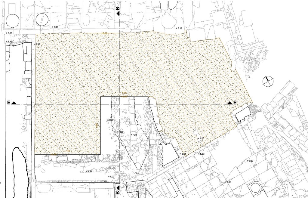 - διαμόρφωση ορύγματος ανάδειξης με περιμετρικά κατακόρυφα μέτωπα, ώστε να προσομοιάζει σε ανασκαφικό όρυγμα το οποίο λειτουργεί ως μια “καταπακτή” που άνοιξε στον χρόνο, αφήνοντας εμφανή ως μάρτυρες τα κατάλοιπα προγενέστερων φάσεων