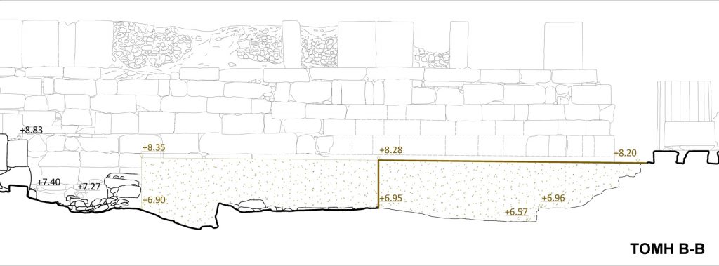 - της κατάχωσης του βορειότερου τμήματος του σκάμματος που εκτείνεται στα δυτικά του ανατολικού “τοίχου αντιστήριξης” των ανασκαφέων, φροντίζοντας ωστόσο να παραμείνουν εμφανή τα αξιολογότερα κατάλοιπα προγενέστερων φάσεων μέσω της διαμόρφωσης κατάλληλου ορύγματος για την ανάδειξή τους