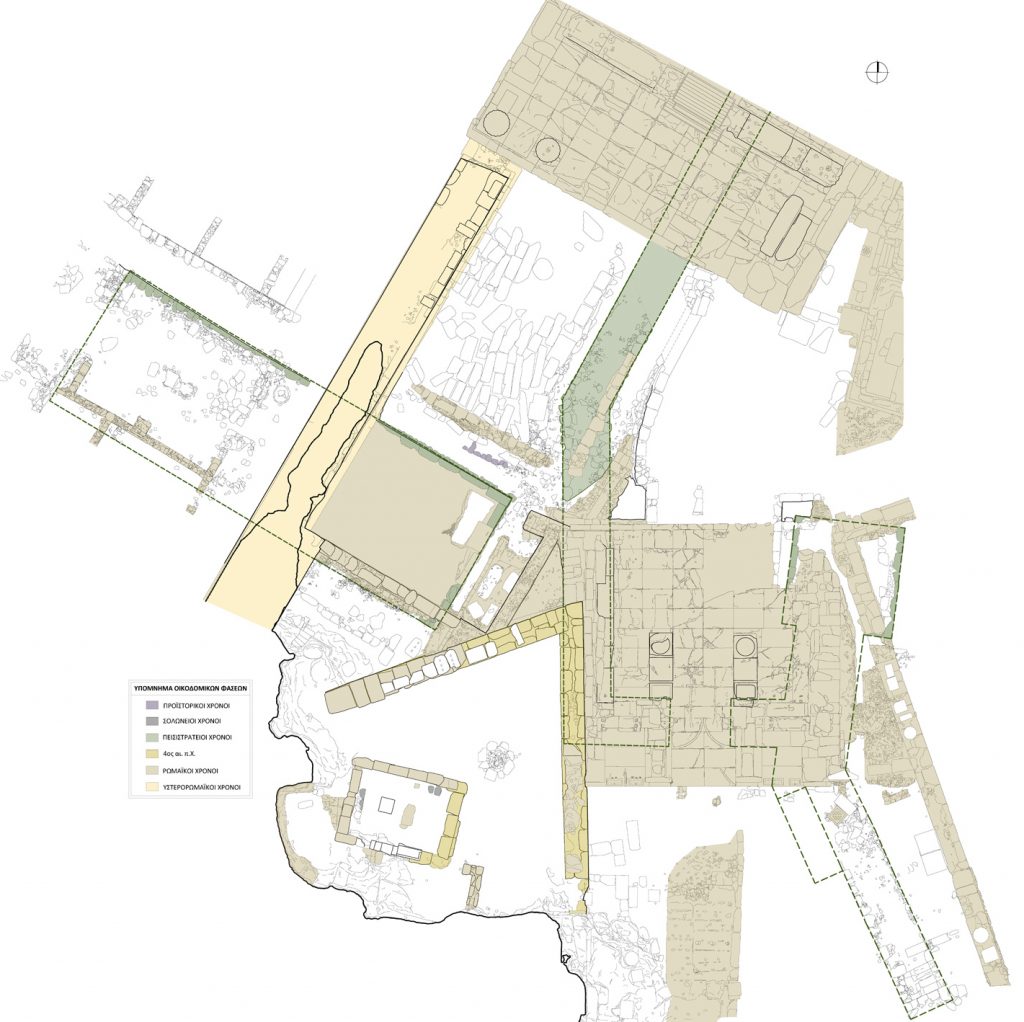 Σχέδιο κάτοψης της ευρύτερης περιοχής της Εισόδου, με χρωματική απεικόνιση των οικοδομικών φάσεων στις οποίες ανήκουν τα εμφανή σήμερα σωζόμενα κτίσματα.