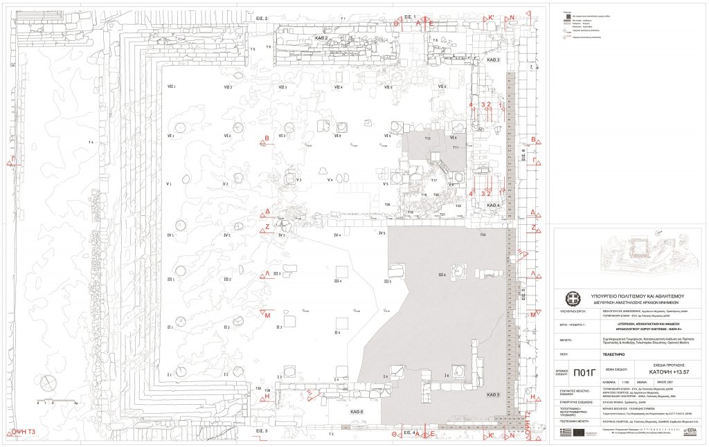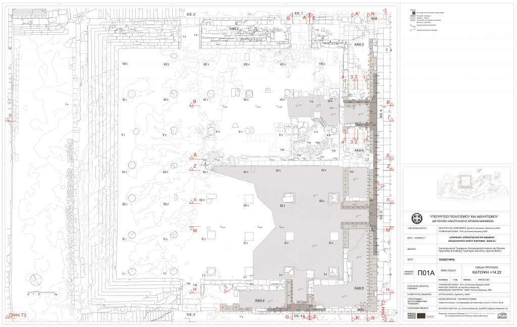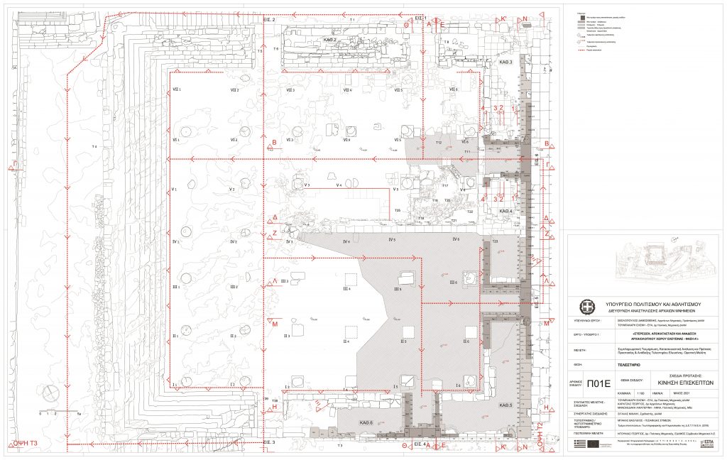 Ε. Στις εμφανείς κατακόρυφες επιφάνειες που δημιουργούνται, γίνεται εφαρμογή επιχρίσματος γαιώδους σύστασης και απόχρωσης εις τρόπον ώστε να δίνεται η εικόνα ανασκαφής, η οποία έχει αποκαλύψει όσες αρχαίες δομές αφήνονται ορατές.
